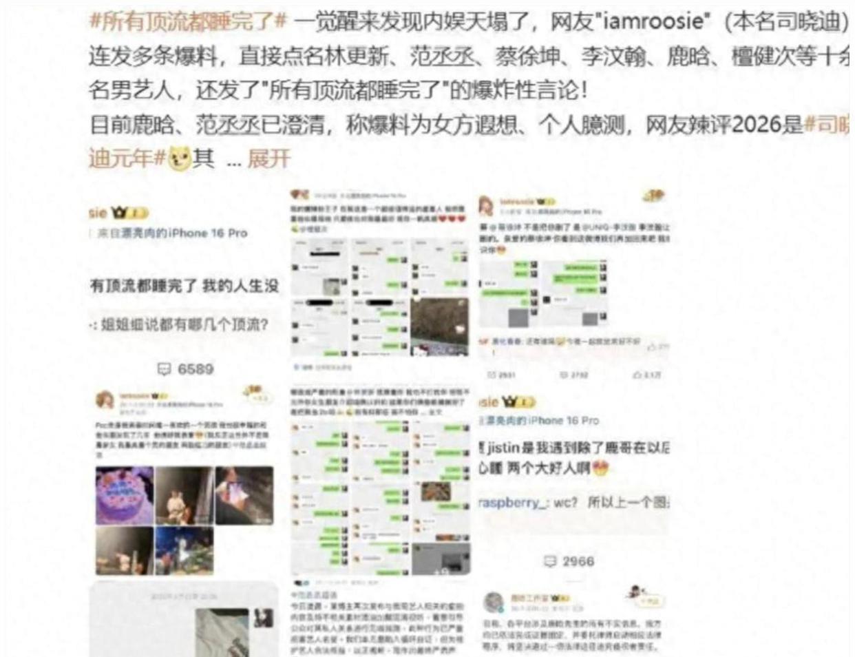 一张多年前的聚会偷拍旧照,就能把一个努力八年、阳光满分的男孩推上风口浪尖?2026开年第一瓜 司晓迪深夜放炸弹,粉丝直接急疯了!**“一张偷拍旧照+一句‘青春唯一喜欢的男孩子’,就能把一个努力八年的阳光男孩按在地上摩擦?娱乐圈的隐私,比玻璃还脆。”**2026年才刚开头 内娱就直接炸了。网红司晓迪凌晨连发爆料,自称“睡遍顶流” 点名一堆男星 其中范丞丞被多年前聚会旧照+暧昧配文直接推上热搜 甚至扬言有“亲密视频”。